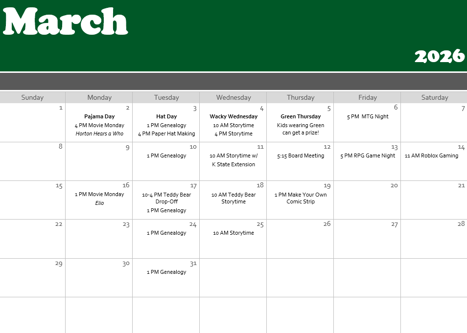 Check out our upcoming events for March. We have tons of activities for Dr Seuss Week and Spring Break! Follow us on Facebook for more details on each day’s events!