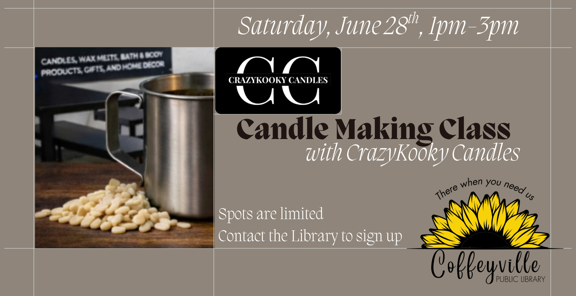 Spots are limited — grab yours before they’re gone!  You can reserve your spot by contacting the library.